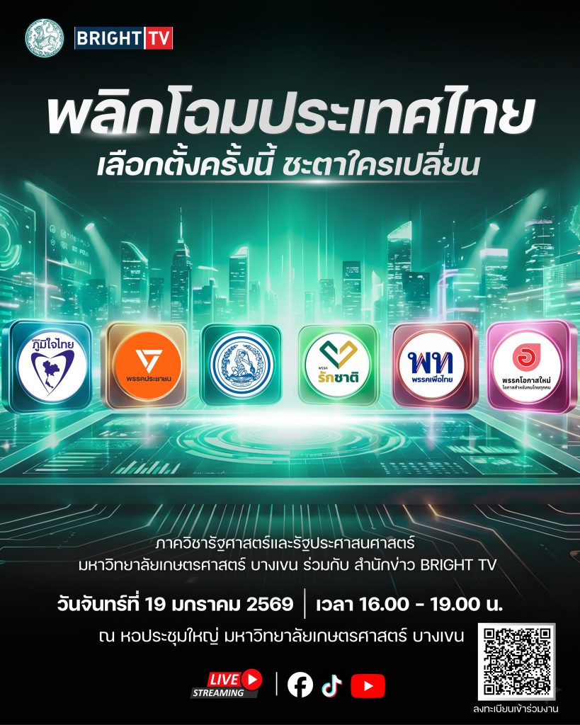 อ่านเพิ่มเติมดีเบต “พลิกโฉมประเทศไทย เลือกตั้งครั้งนี้ ชะตาใครเปลี่ยน” พบแสดงวิสัยทัศน์จาก 8 พรรคการเมือง วันจันทร์ที่ 19 มกราคม 2569 ณ หอประชุมใหญ่ มหาวิทยาลัยเกษตรศาสตร์ บางเขน ถ่ายทอดสดผ่าน BRIGHT TV เวลา 16.00 – 19.00 น.