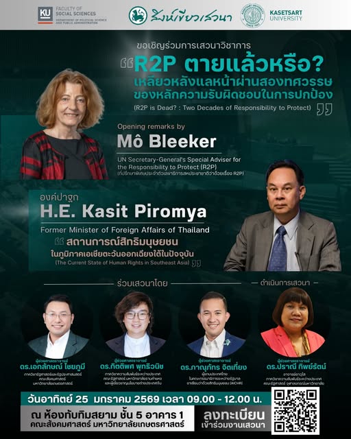 ขอเชิญร่วมการเสวนาวิชาการ “R2P ตายแล้วหรือ? เหลียวหลังแลหน้าผ่านสองทศวรรษของหลักความรับผิดชอบในการปกป้อง”